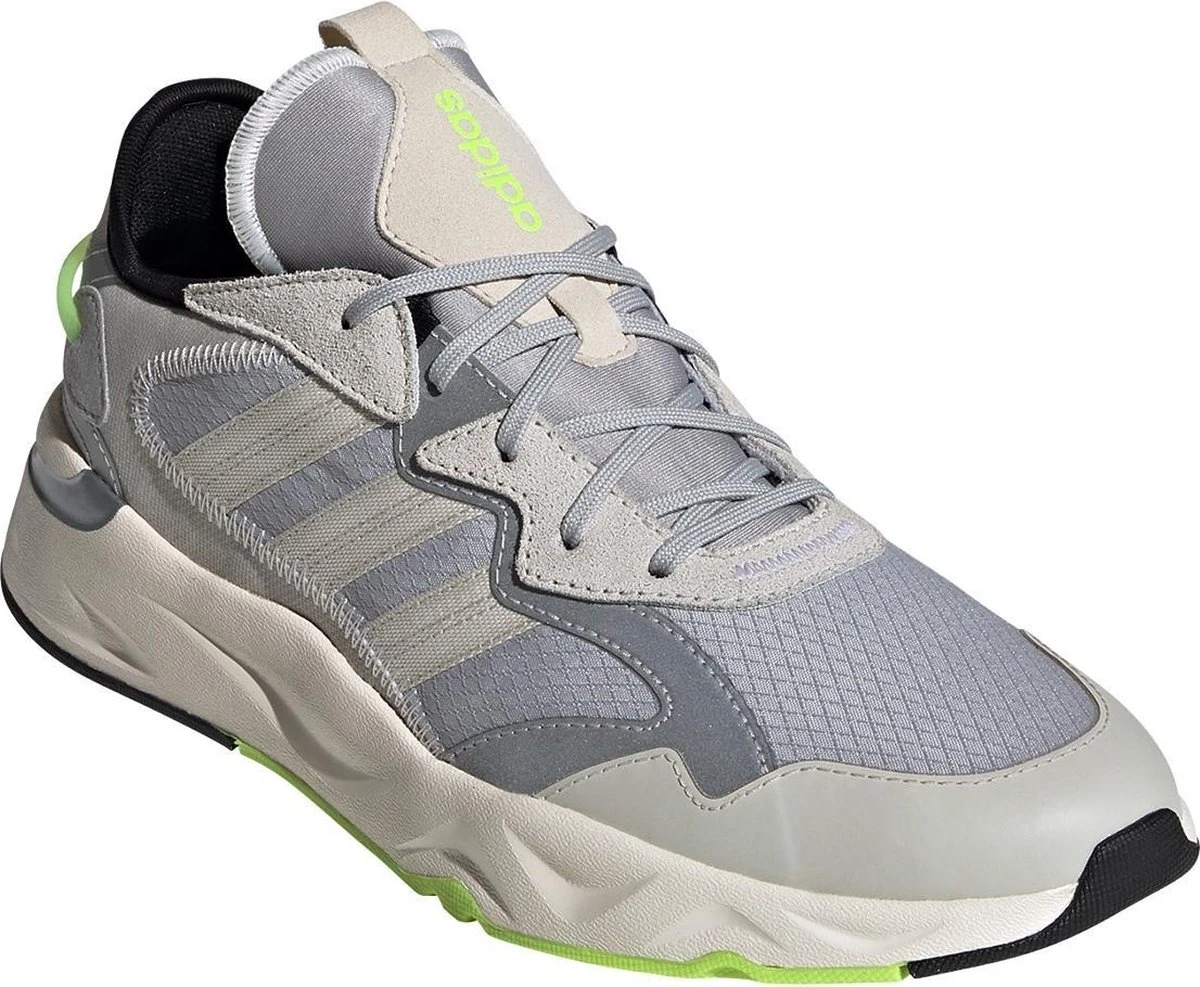 De beige met grijze Futureflow sneakers van adidas combineren een casual streetwear-look met een flinke dosis op hardlopen geïnspireerde performance en stijl. De grove zool biedt een comfortabele demping, het mesh bovenwerk zorgt voor ventilatie en de felgroene en reflecterende details zorgen voor een opvallende look.