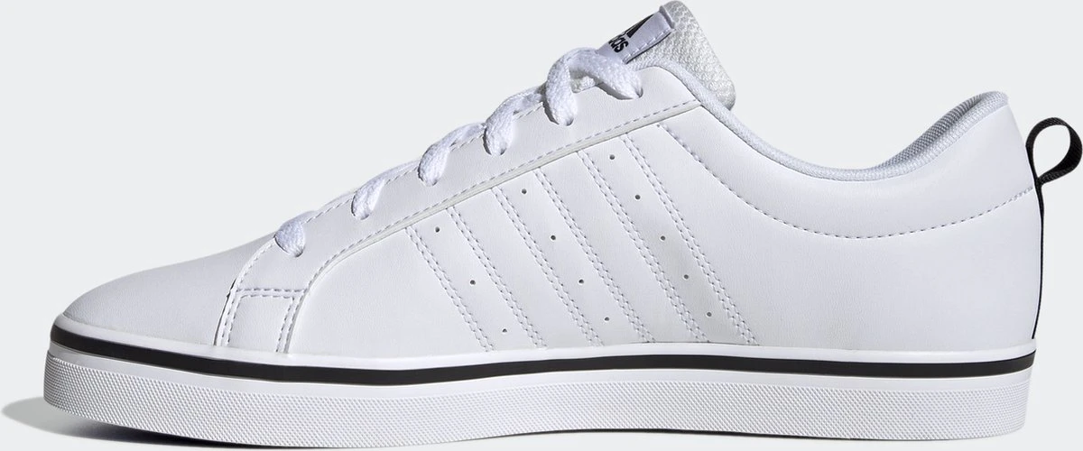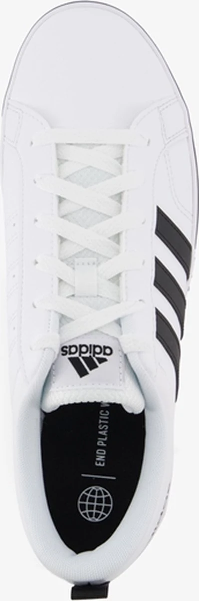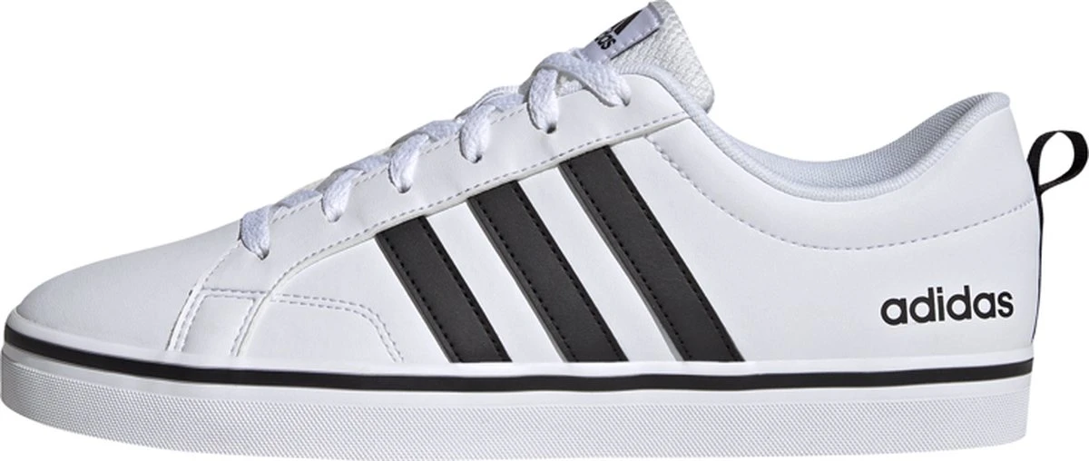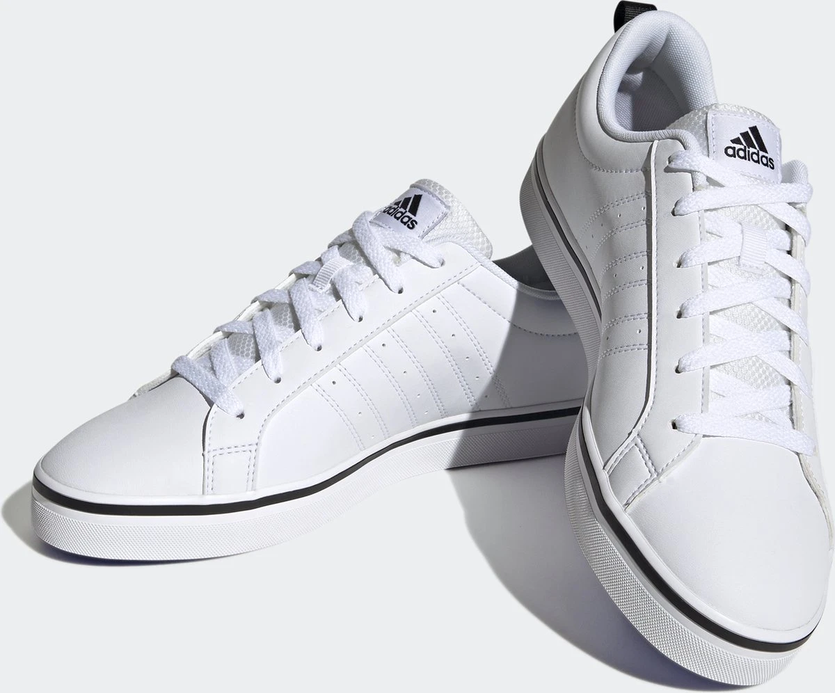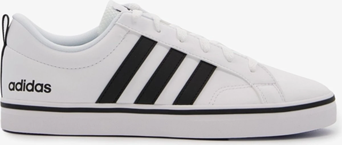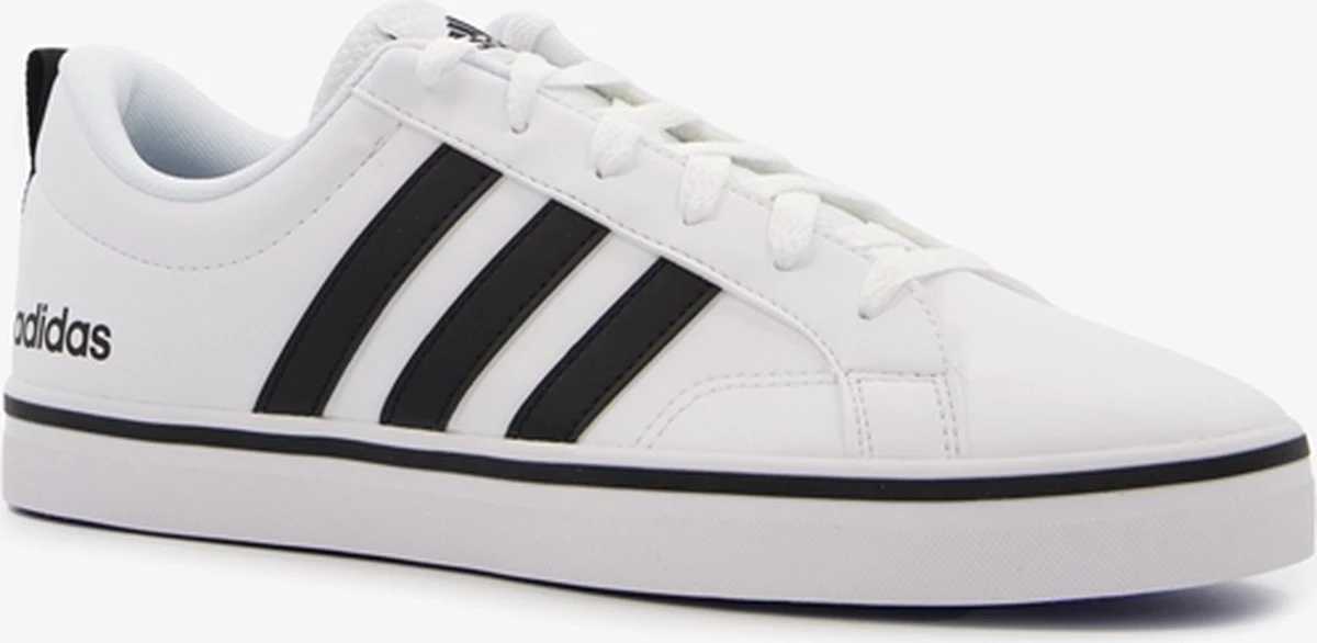 Witte Adidas VS Pace 2.0 heren sneakers. Gemaakt van textiel, een binnenwerk van textiel en de sneakers zijn voorzien van een stevige profielzool. De sneakers hebben vetersluiting en een aantreklusje op de hiel. Voorzien van zwarte Adidas 3-stripes op het buitenwerk en een merklogo op de hak en de tong.