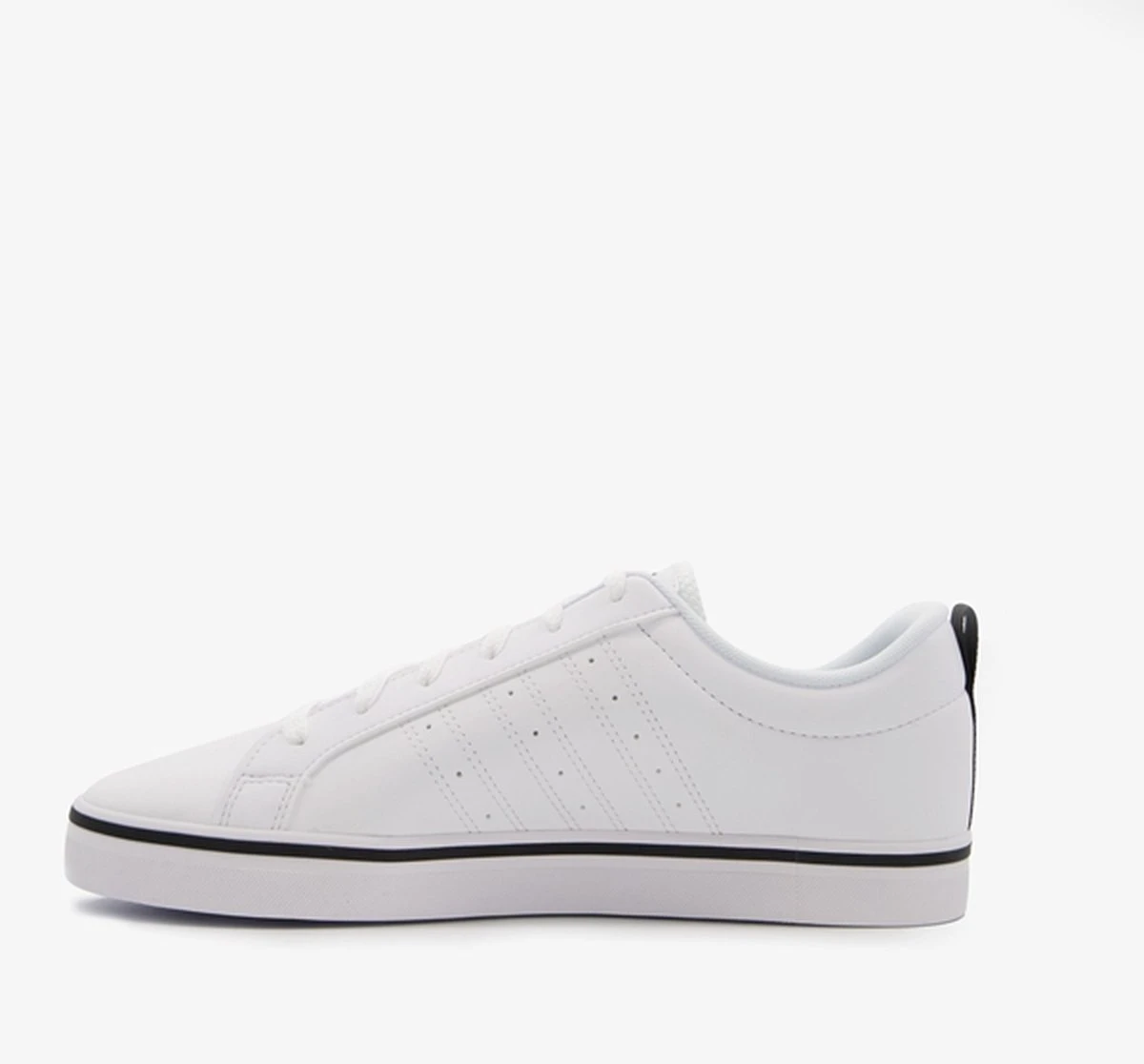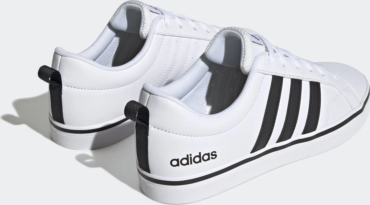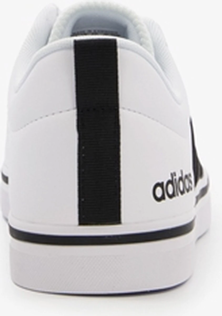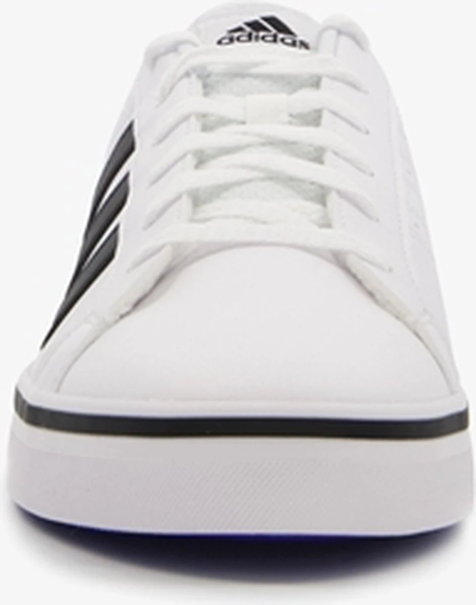 Witte Adidas VS Pace 2.0 heren sneakers. Gemaakt van textiel, een binnenwerk van textiel en de sneakers zijn voorzien van een stevige profielzool. De sneakers hebben vetersluiting en een aantreklusje op de hiel. Voorzien van zwarte Adidas 3-stripes op het buitenwerk en een merklogo op de hak en de tong.