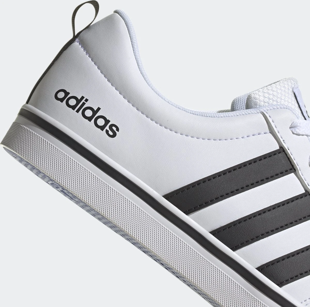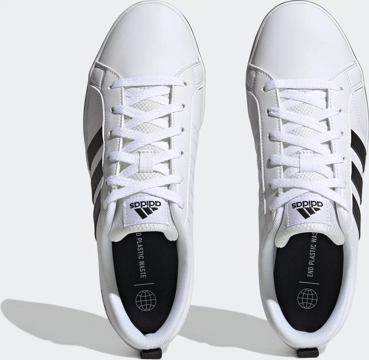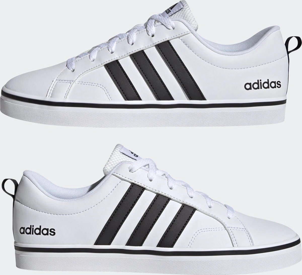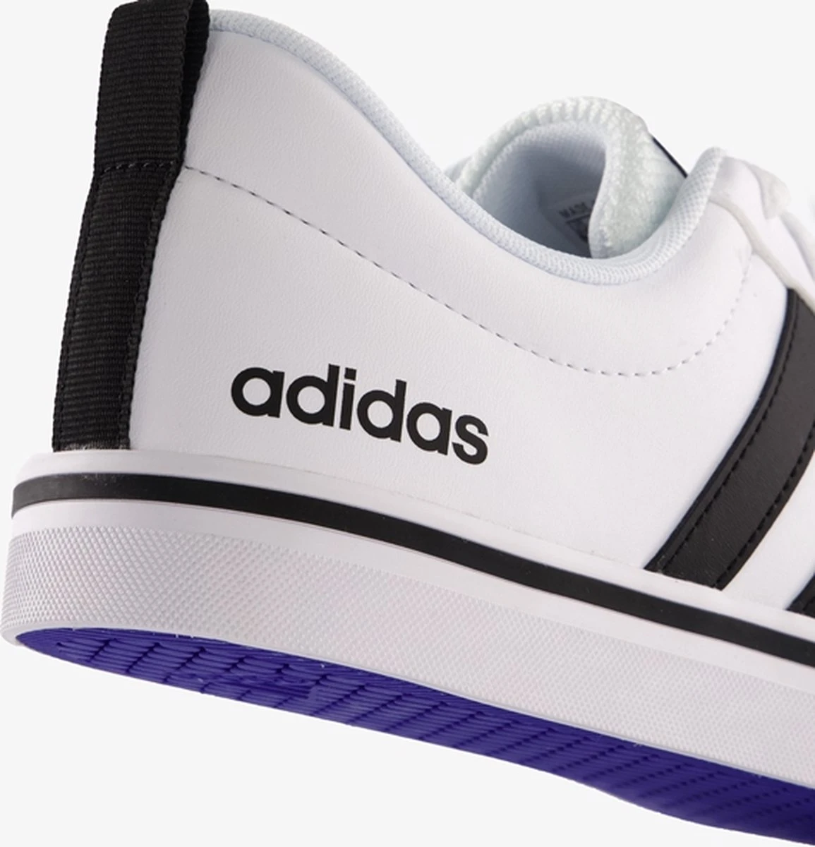 Witte Adidas VS Pace 2.0 heren sneakers. Gemaakt van textiel, een binnenwerk van textiel en de sneakers zijn voorzien van een stevige profielzool. De sneakers hebben vetersluiting en een aantreklusje op de hiel. Voorzien van zwarte Adidas 3-stripes op het buitenwerk en een merklogo op de hak en de tong.