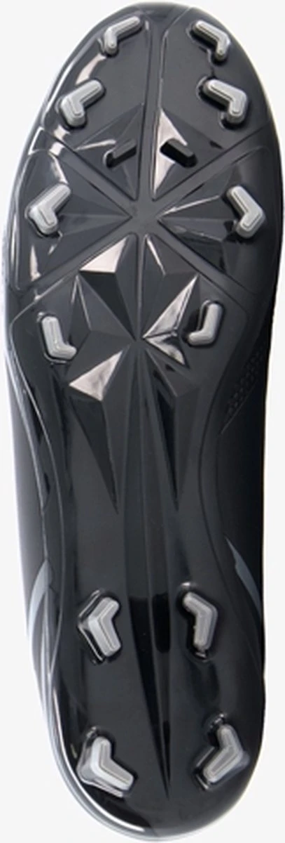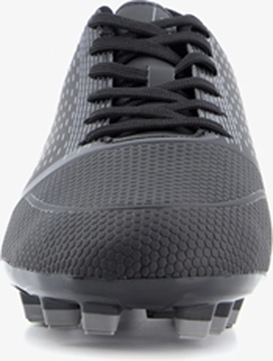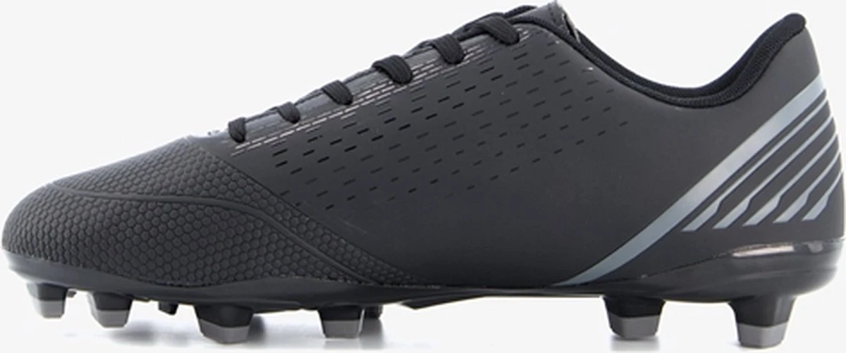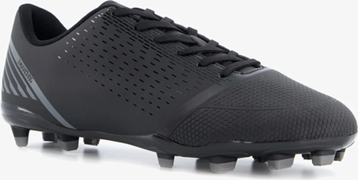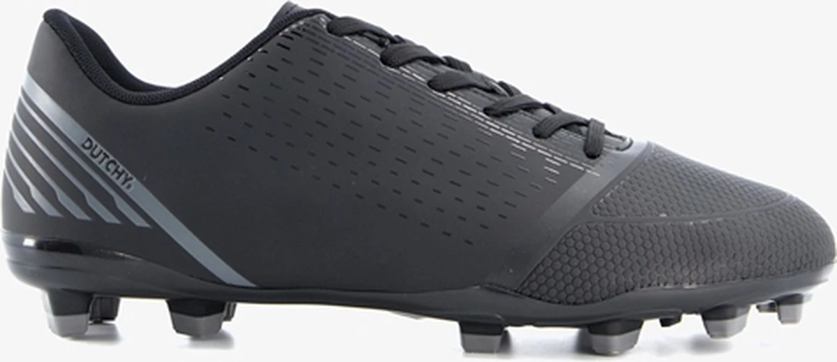 Zwarte Dutchy Goal voetbalschoenen voor heren. Gemaakt van imitatieleer, een binnenwerk van textiel en een stevige zool met Firm Ground noppen. Deze FG zool is geschikt voor (droog)natuurgras en bestaat uit kunststof noppen die je veel grip geven op het veld. De voetbalschoenen hebben een vetersluiting en vast voetbed van textiel. Voorzien van grijze accenten op het bovenwerk.