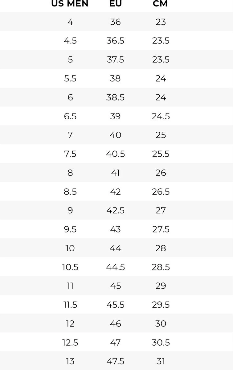 Jordans (Nike sneakers) vallen kleiner uit. Voor een perfecte pasvorm kunt u het beste een halve maat groter bestellen bij smalle voeten of een hele maat groter bestellen bij brede voeten. Jordans vallen ongeveer hetzelfde als de Nike Air Force 1 en de Nike Air Max 1. Twijfelt u bijvoorbeeld tussen een maat 37,5 of 38? Kies dan voor een maat 38. Controleer welke maat het beste overeenkomt met uw voetlengte in centimeters. Uw voetlengte meet u van het puntje van uw grote teen tot de hiel (zie foto voor maattabel.)