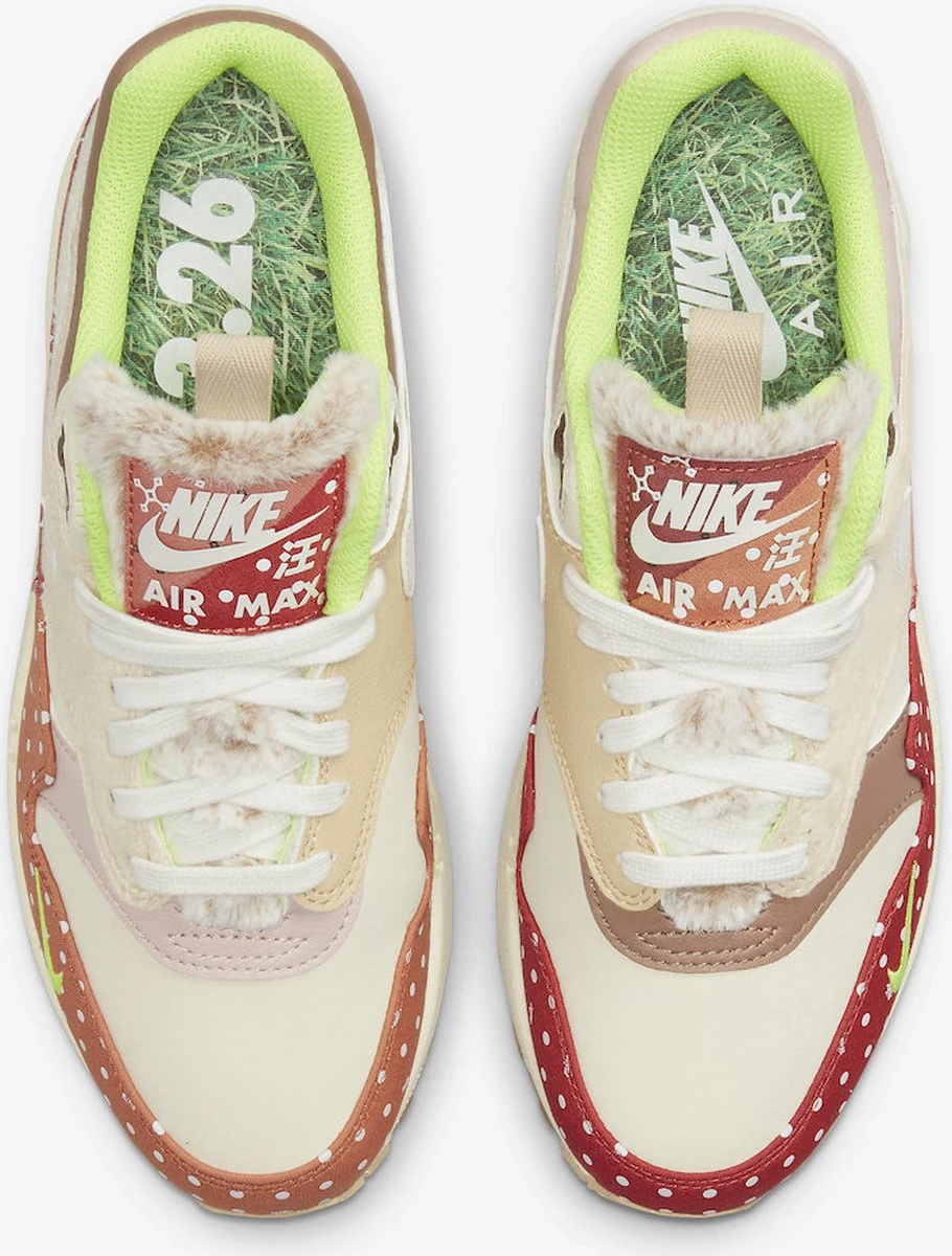 De kicks zijn speels in elke zin van het woord. Harige texturen die emblematisch zijn voor een hond zijn geleverd aan de overlays langs de middelste voet en hielen, evenals aan de randen van de tongen. Spatborden spelen in op de wilde esthetiek en de voorvoet is bedrukt met rode achtergronden, witte stippen en retro Nike-logo’s, terwijl de achterkant is gestyled in roze canvas en versierd met abstracte patronen. Om het op huisdieren geïnspireerde motief verder uit te breiden, kleedt Nike de inlegzoolunits aan met grasachtige afbeeldingen die waarschijnlijk symbolisch zijn voor een hondenpark en vormt het de enkelogen in een op hondenbot geïnspireerd silhouet. Daarnaast zijn de kicks verpakt met een Metallic zilveren hangtag van het merk Nike en een rode zakdoek.