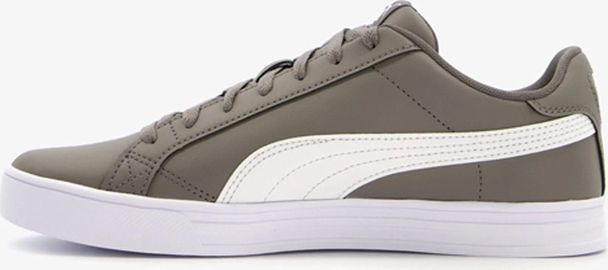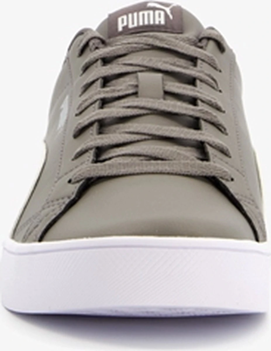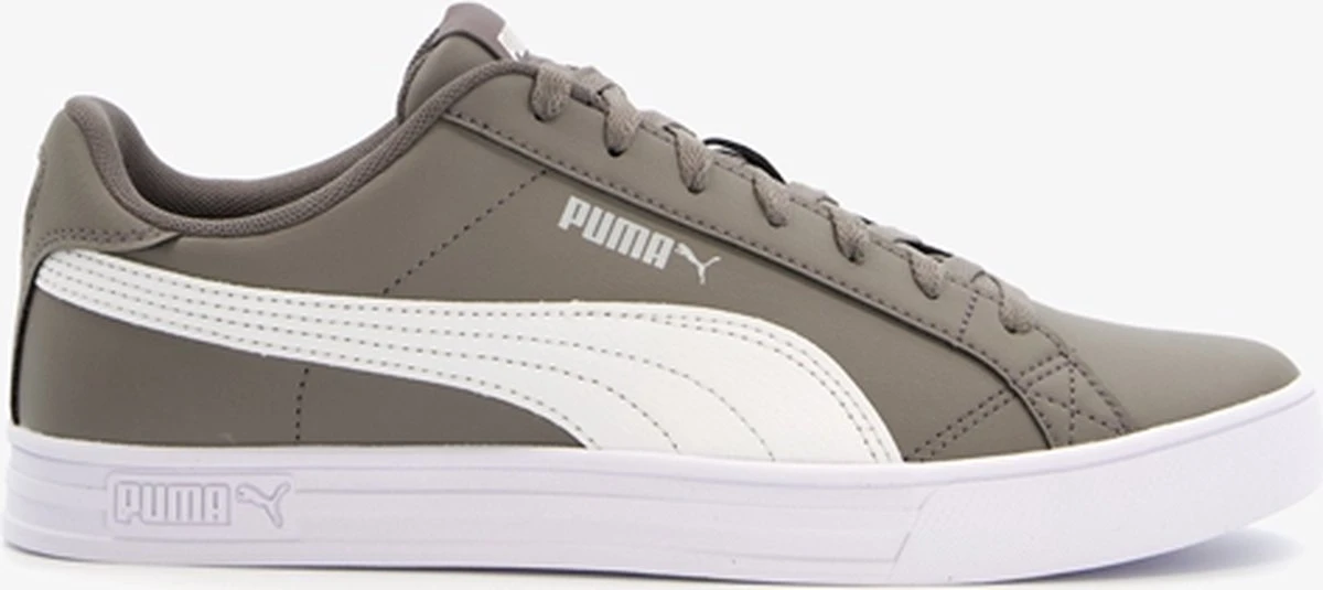 Grijze Puma Smash Vulc sneakers voor heren. Gemaakt van imitatieleer, een binnenwerk van textiel en een stevige profielzool. De sneakers hebben een vetersluiting en vast voetbed van textiel. Voorzien van witte Puma formstripes rondom de schoen en merkaccenten op de hak, tong en buitenzijde.