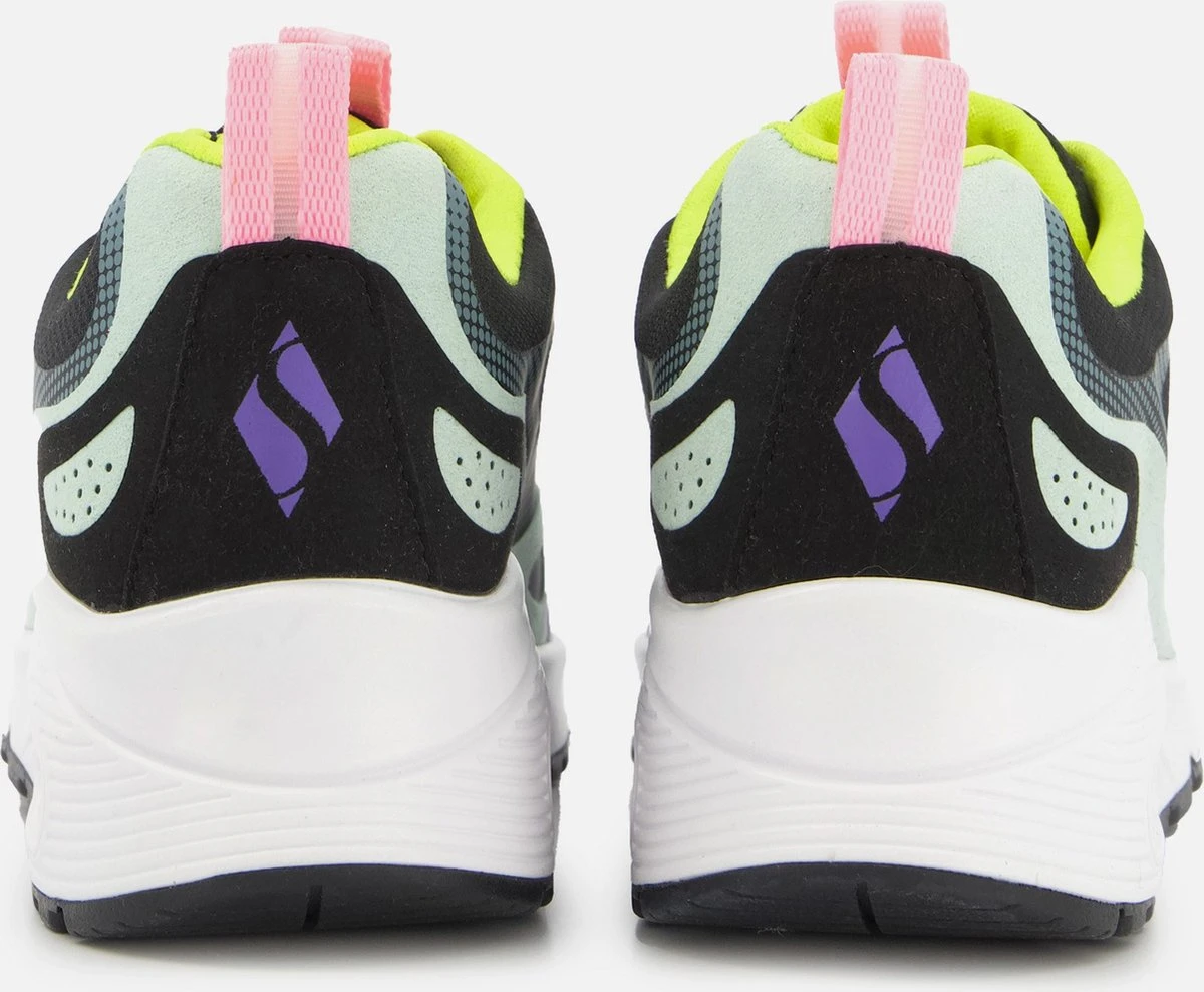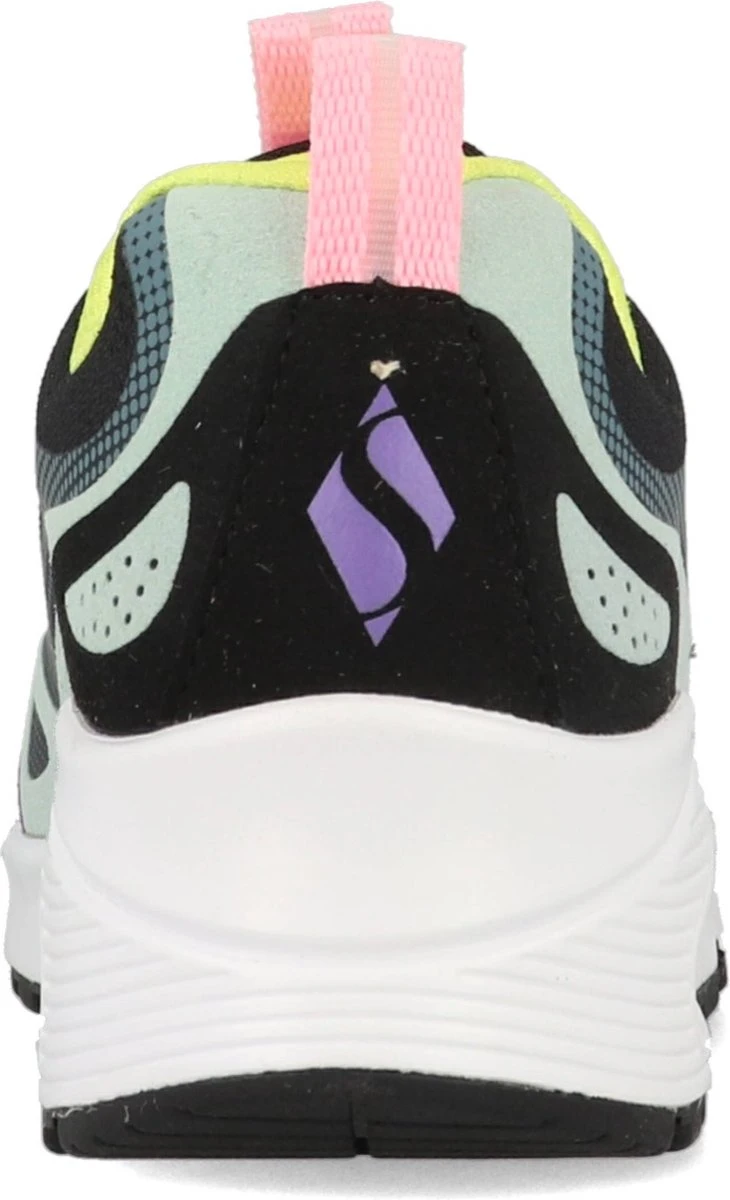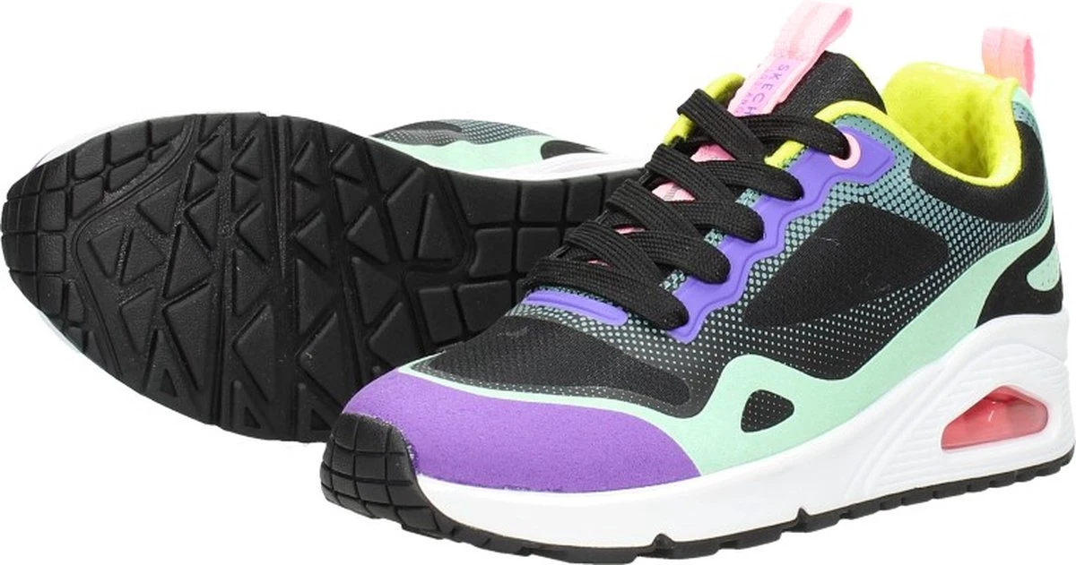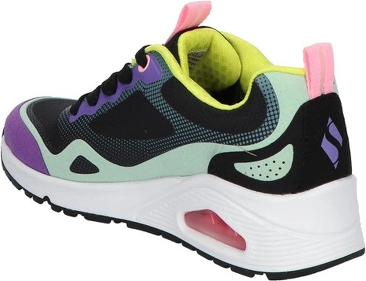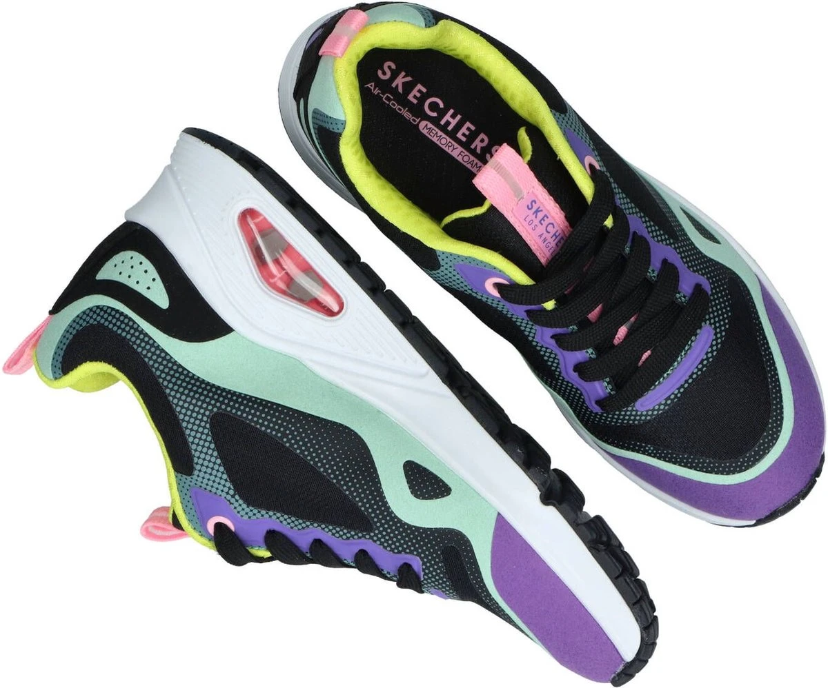 Specificaties: Pasvorm: normale pasvorm Demping: Skech-Air tussenzool (zichtbaar in de hak) en Air-Cooled Memory Foam binnenzool Bovenwerk: synthetisch leer Buitenzool: flexibele rubberen buitenzool Kleur: zwart – groen – paars Materiaal: synthetisch materiaal – textiel – rubber